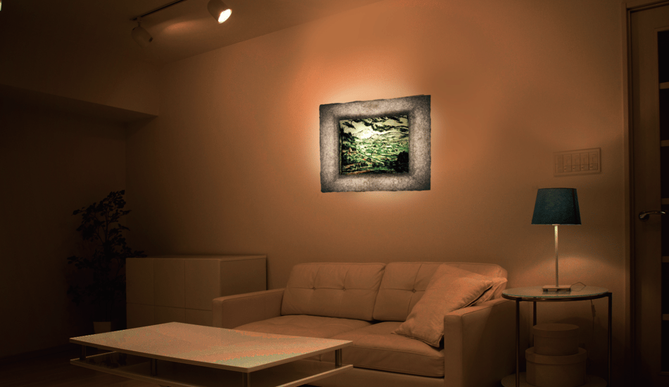 額装は越前手漉き和紙。作品も和紙に印刷しています。和紙に印刷することで独自の灯りアートが楽しめます。