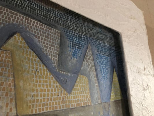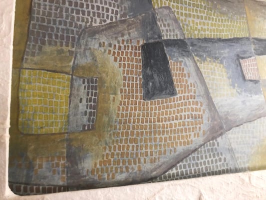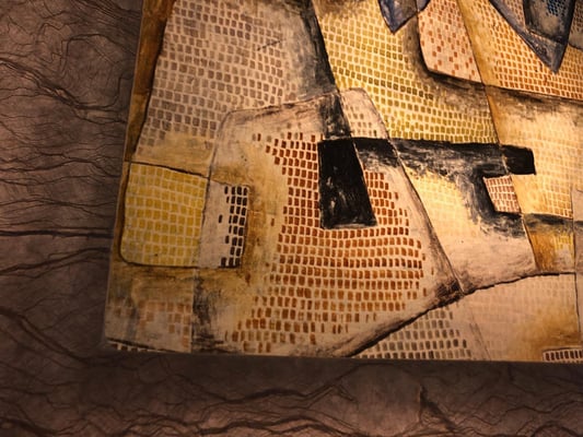 クレーは表現主義、キュビスム、シュルレアリスムなど当時の前衛芸術運動のさまざまなスタイルから影響を受けた個性的なスタイルが特徴。 クレー岩の海岸と題されていますが、田畑や建物のレンガ柄にも連想させます。作品に近づいてみると薄い色を塗り重ねて仕上げられていて、配列にリズム感がありほのぼのした可愛い作品です。