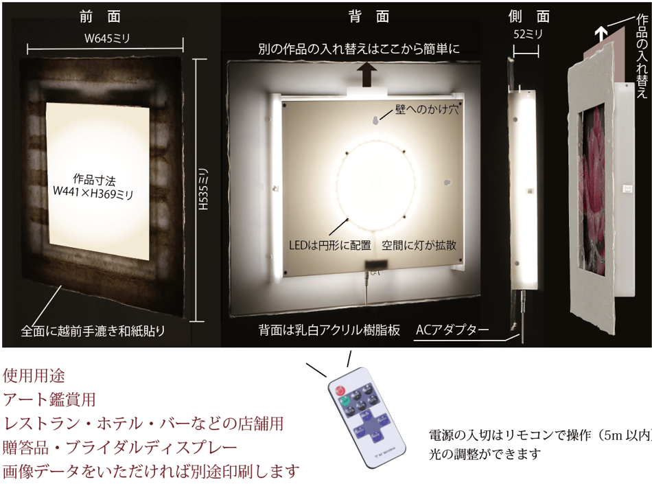 額装は越前手漉き和紙。作品も和紙に印刷しています。和紙に印刷することで独自の灯りアートが楽しめます。