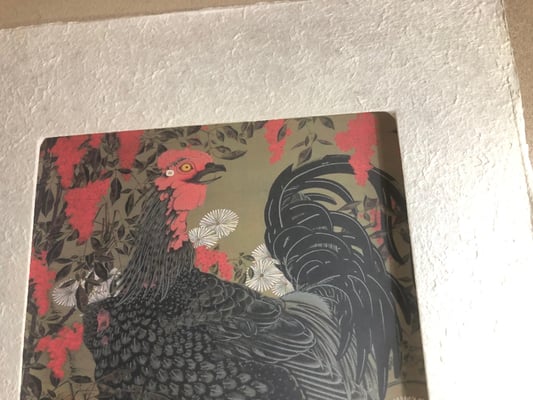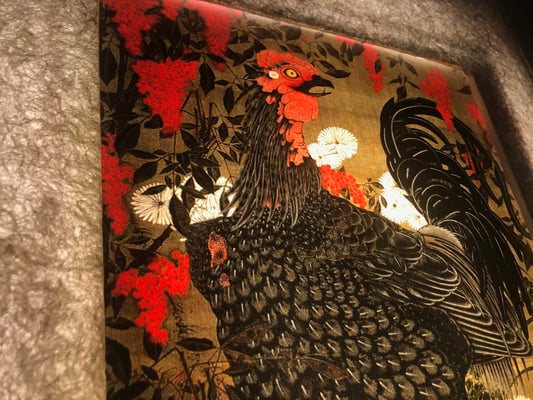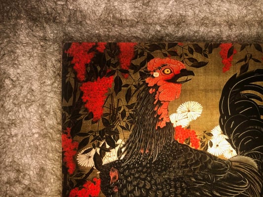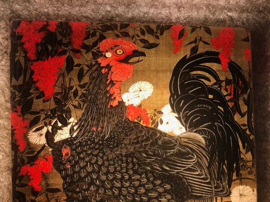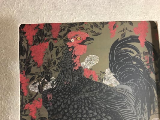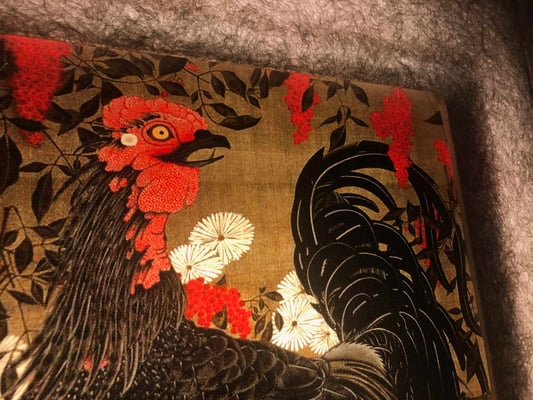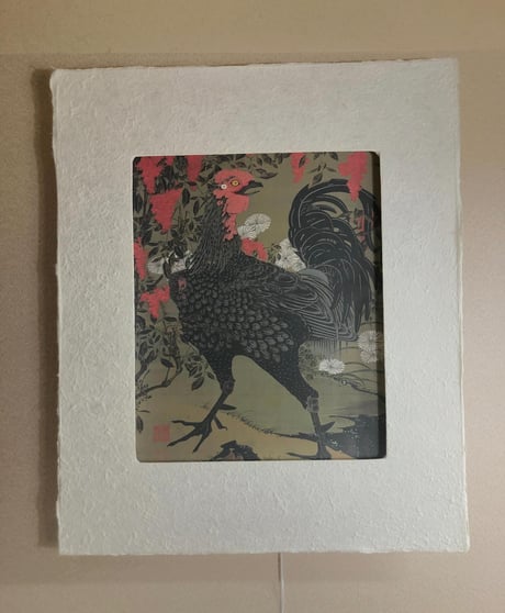 江戸時代中期の京都で、独自の世界観を描いた伊藤若冲。その描写と独自の色彩感覚は、水墨画が基で精密でありながら大胆な表現と構図が魅力です。また自由な遊び心に溢れた表現は作品の深みと味わいを醸し出しています。この「南天雄鶏図」はナンテンの赤、シャモのトサカの赤と黒、菊の白、小禽の黄色と、色の対比が力強く美しい作品です。それぞれが絶妙なバランスをもって配置されています。