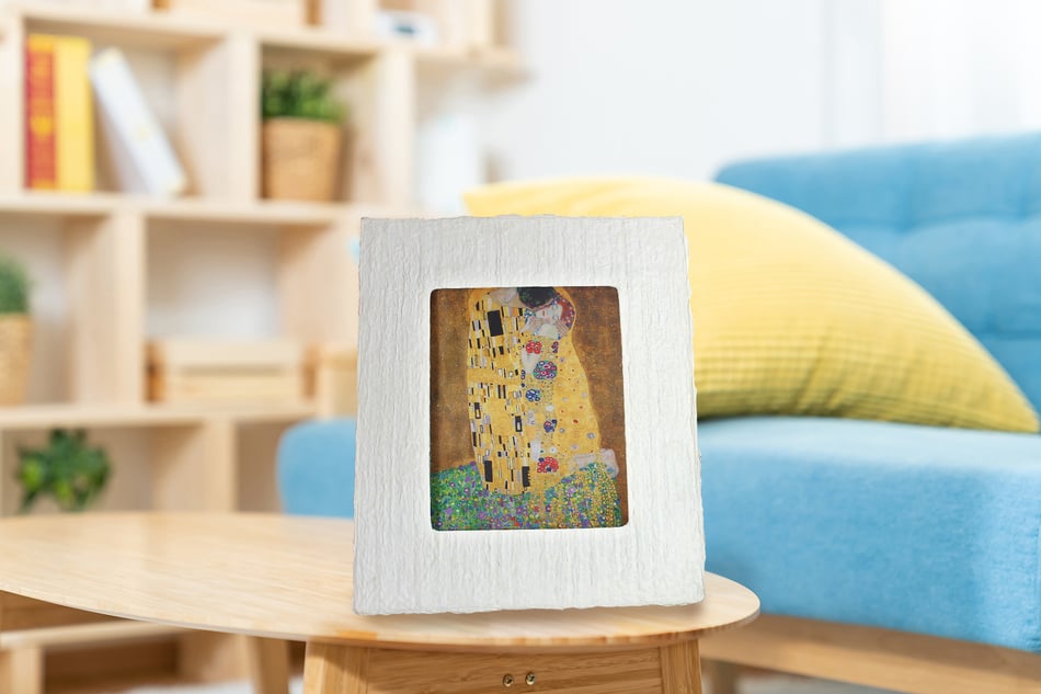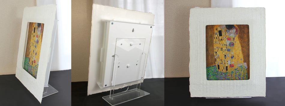 額部分に越前手漉き和紙を贅沢に使用。内側には和紙ック専用和紙に印刷した絵画や写真などを収納し、和らぎ癒される和紙アートとして楽しめます。手漉きでしか味わえない手触り感で見る側を優しく包み込みます。