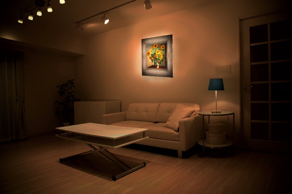 通常の複製画と違い、和紙に名画を印刷して、和紙額縁の灯りの中で輝かせます。