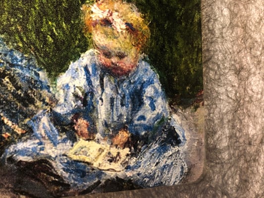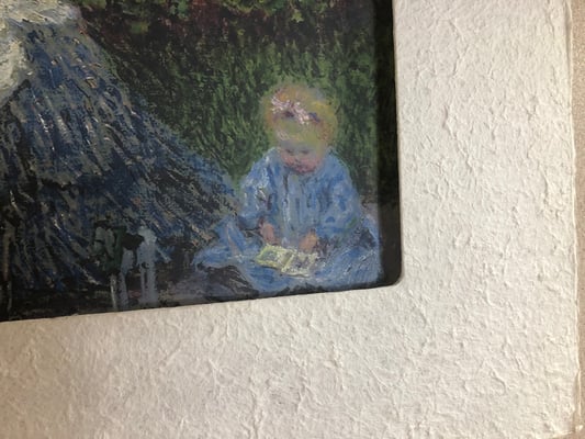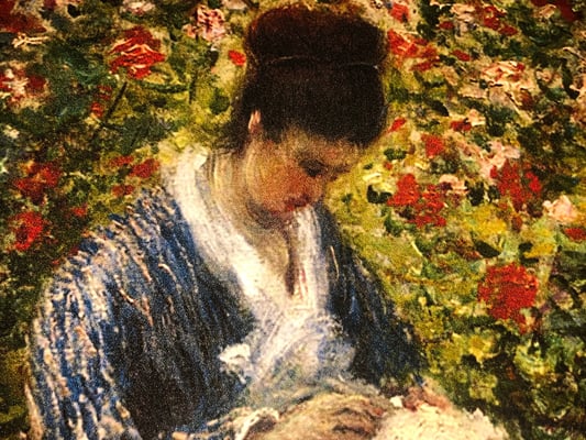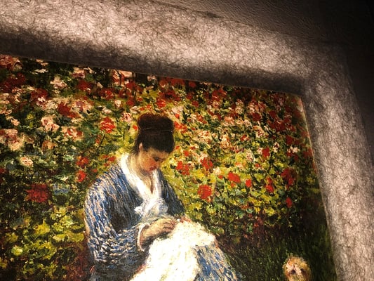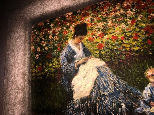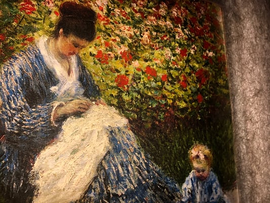モネは印象派の代表的な画家。戸外制作を基本に自然の中で輝く外光の美しさに強く惹かれ、その探求と表現に生涯を捧げた芸術家。モネの家の庭で妻カミーユと息子ジャンを描いた作品であり、家族への愛と人間としての豊かさの本質が表現されている。