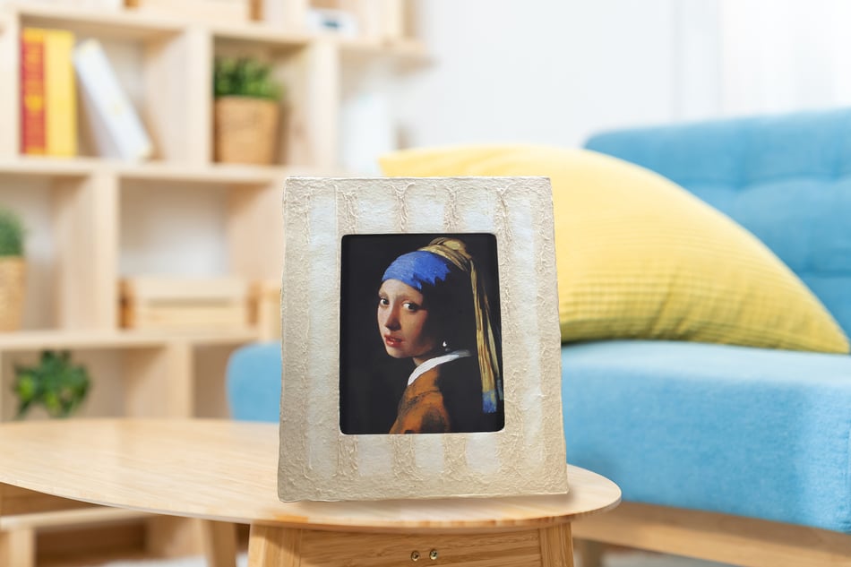 額部分に越前手漉き和紙を贅沢に使用。内側には和紙ック専用和紙に印刷した絵画や写真などを収納し、和らぎ癒される和紙アートとして楽しめます。手漉きでしか味わえない手触り感で見る側を優しく包み込みます。