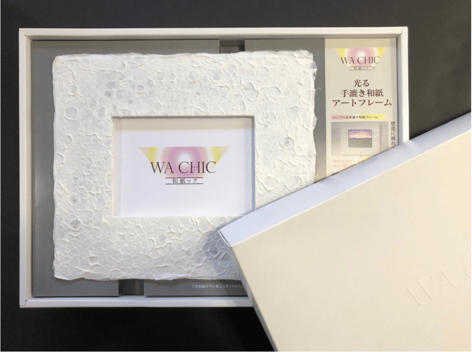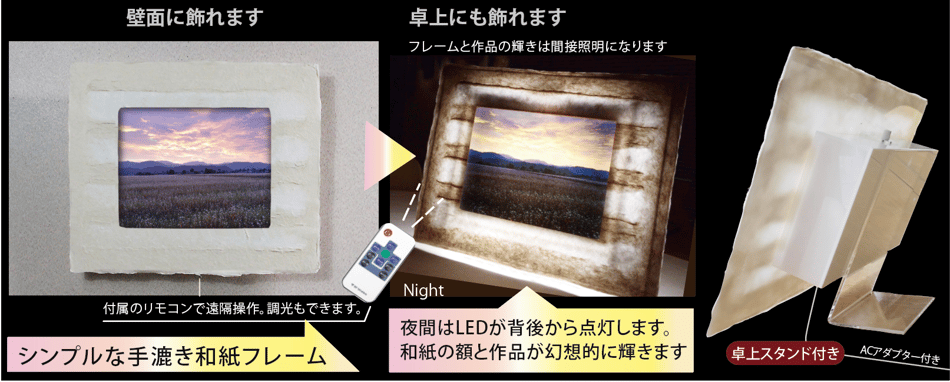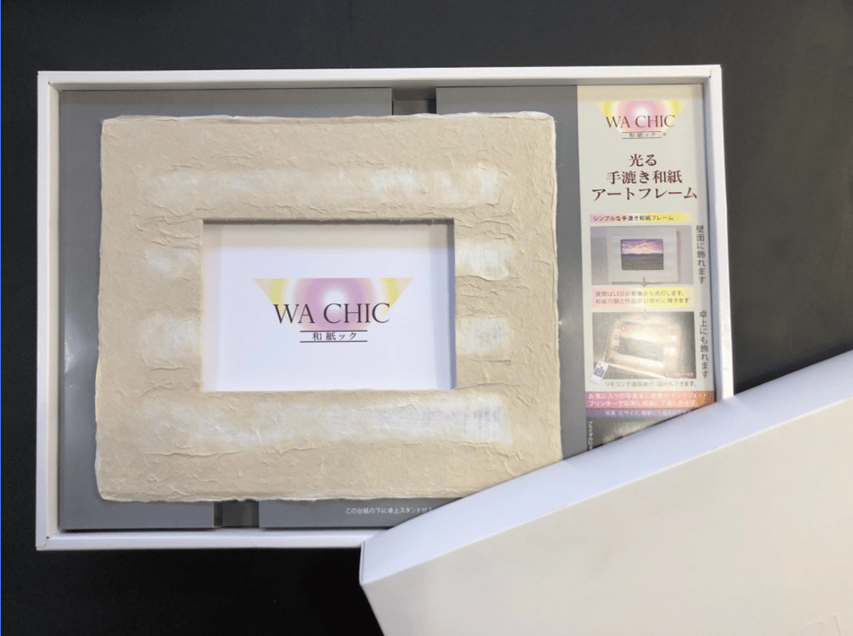 和紙ックをもっと身近に使っていただきたいと新商品(2Lタイプ)を発売しました。2Lプリントサイズに合わせコンパクト型です。卓上スタンドを使ってテーブル卓上を中心にお使いできます。もちろん壁かけも可能です。