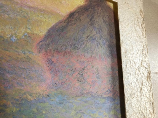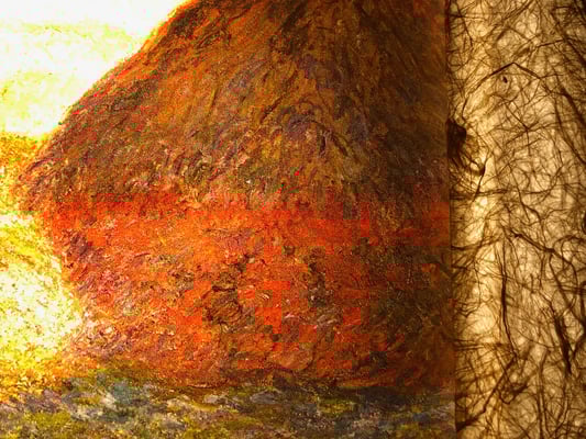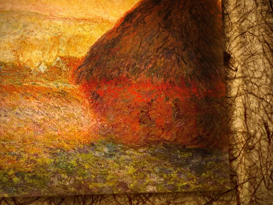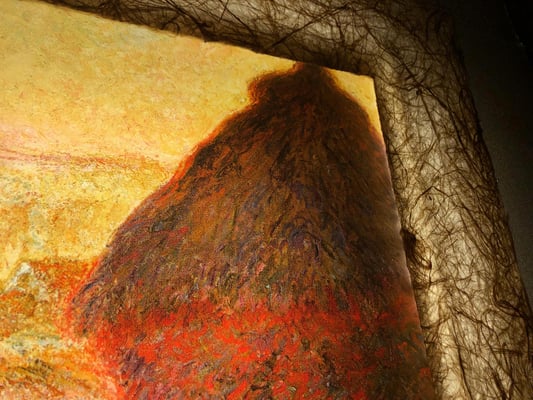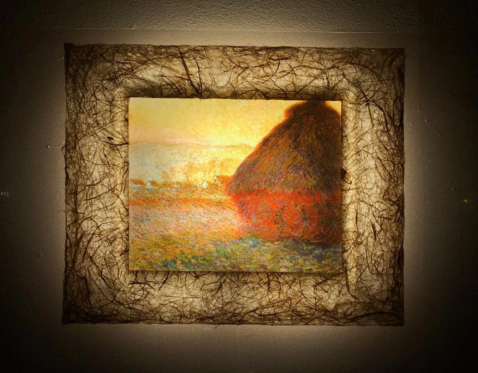 モネは印象派の代表的な画家。戸外制作を基本に自然の中で輝く外光の美しさに強く惹かれ、その探求と表現に生涯を捧げた芸術家。「積みわら」の連作は、モネが何度も描いた、時刻、季節、光線、天候など自然要因の変化が主題に及ぼす効果を描き分けた作品群。光や色彩を一つ一つ丁寧にとらえた筆跡が和紙ックで再現されている。