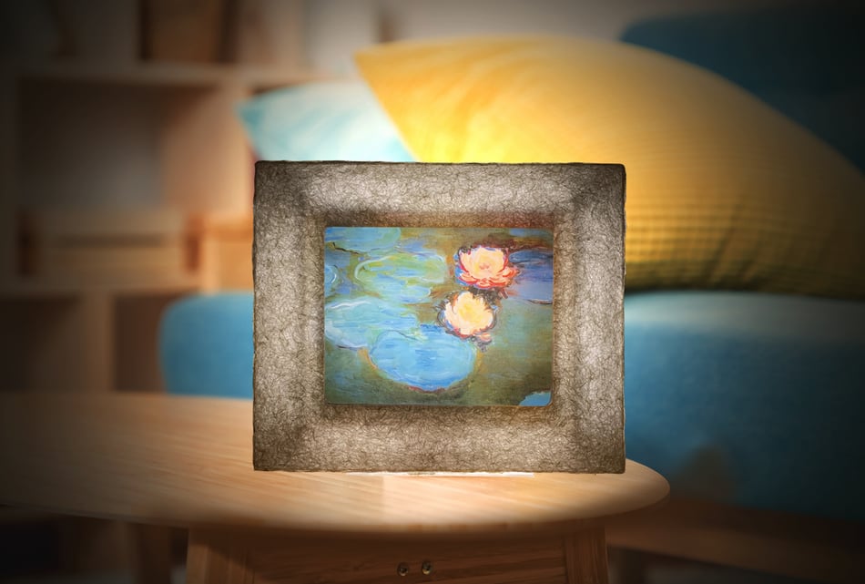 作品も専用和紙に印刷して和紙ックに装入。額装と作品を背面から幻想的に照らします。その灯りは間接照明として空間を包み、癒しのアート世界に誘います。 詳しくはこちら